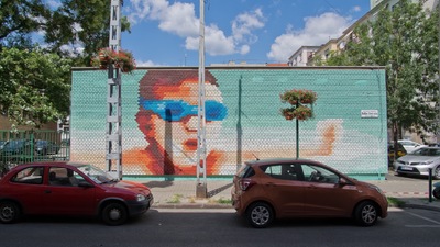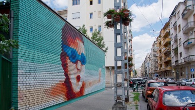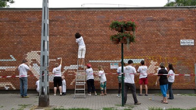Nagyon szuper csapat várt bennünket és öröm volt ennyi lelkes önkéntessel együtt dolgozni. A szülők, tanárok, diákok, volt diákok és környékbeli lakók hatalmas munkát vittek véghez. A nyers téglákból kirakott oldalsó falak komoly kihívást jelentettek a tervezőinknek, de a végeredmény láttán megért minden erőfeszítést, hiszen egy nagyon látványos pixelgrafikát hoztunk létre az épület Hollán Ernő utcai frontján.